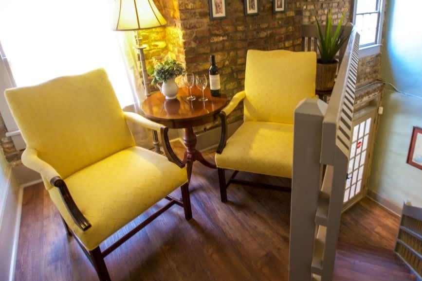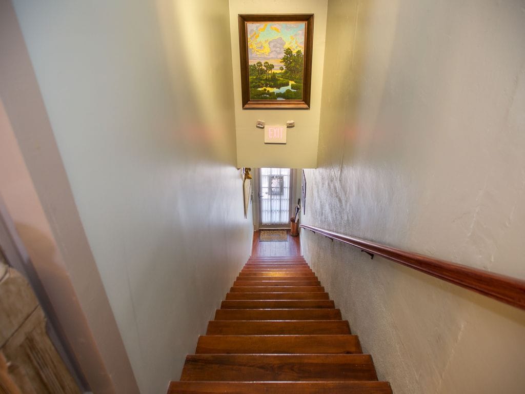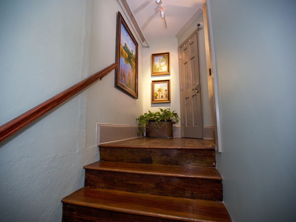 A private main entrance (secured by a keyless entry code) opens up to the staircase leading up to the foyer on the second floor. The foyer leads to a shared patio and to the other studio (we have two studios only in our building). Another staircase leads to the third floor studio (this listing). This building has no elevator. There is a private nook on the third floor landing, a perfect place to enjoy a glass of wine or to catch up on reading.