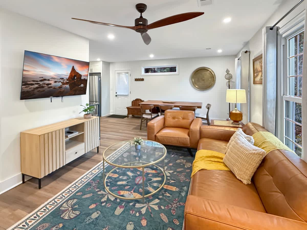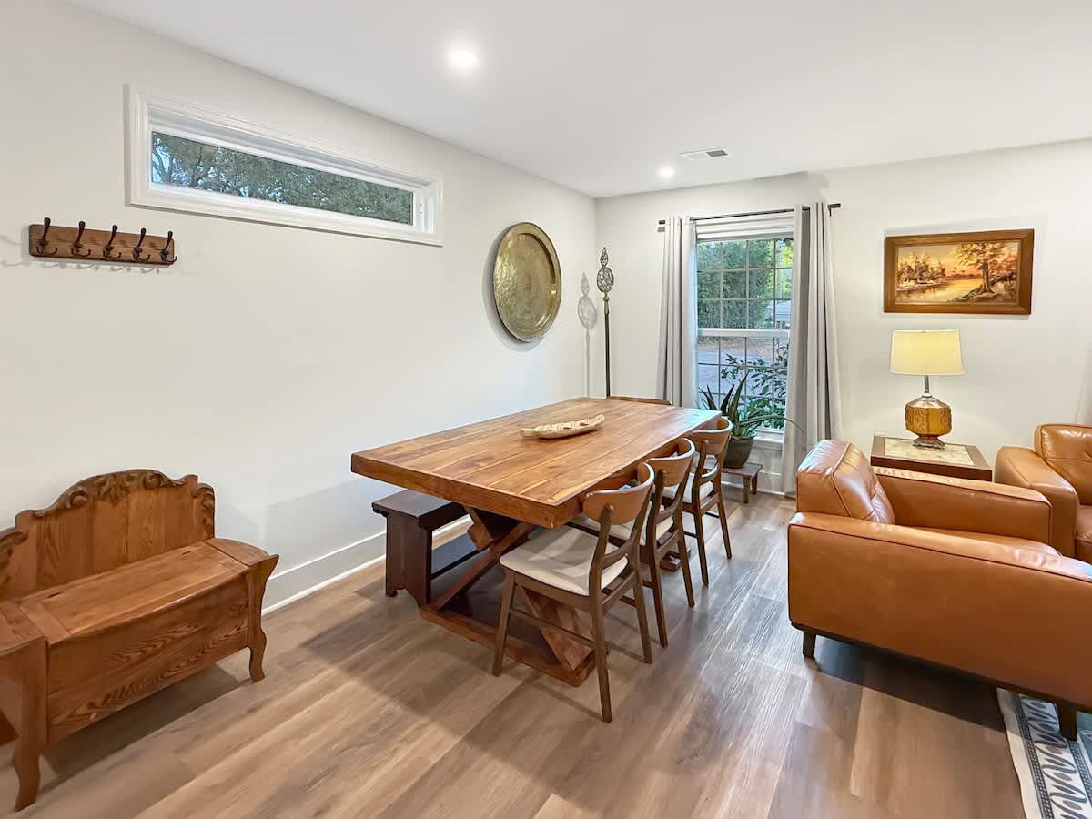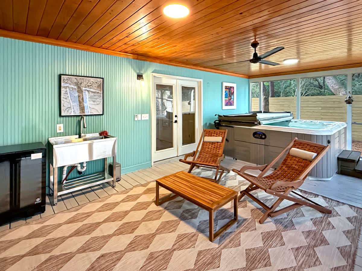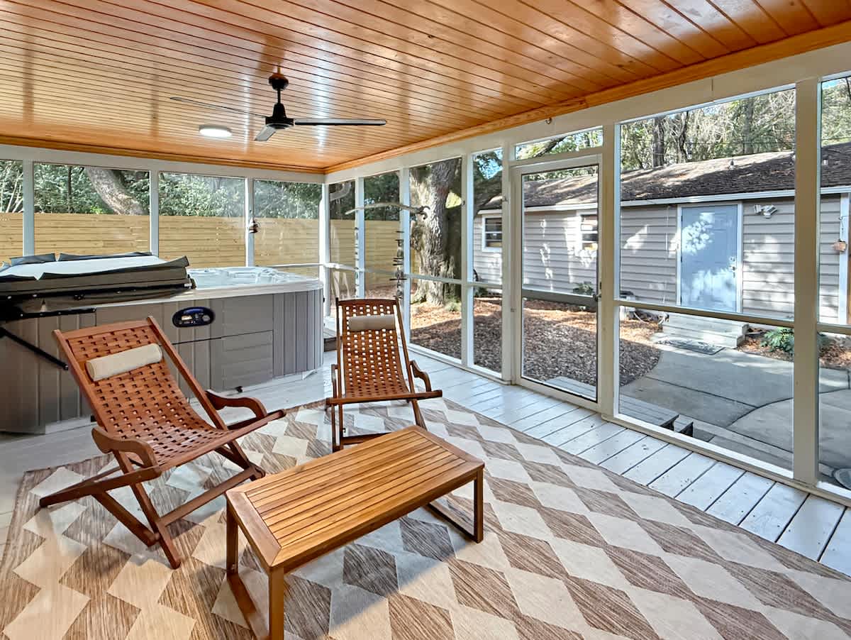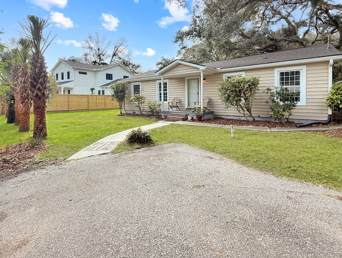The open concept layout is designed to bring everyone together, whether you're lounging on the leather sofa or prepping dinner in the kitchen. The spacious living-dining area is anchored by a beautiful solid-wood table that seats your entire group comfortably—perfect for shared meals, game nights, or spreading out laptops for remote work. The fully remodeled kitchen features quartz countertops, stainless steel appliances, open shelving, and a generous island with seating. Whether you're preparing breakfast or hosting a group dinner, you'll find everything you need to cook and entertain with ease. The home comfortably sleeps eight guests. The primary bedroom features a king bed, an attached private bath with a large walk-in shower, and double doors that open directly onto the screened-in porch and hot tub area. Might we tempt you to end the day with a relaxing soak?!The remaining three rooms each offer comfortable queen beds, soft white linens, lots of natural light (and blackout curtains!) and plenty of closet space. All three bathrooms have been beautifully updated with clean, modern finishes and high-quality tile showers. No Charleston home is complete without a screened-in porch! With the bubbling hot tub, wall-mounted smart TV, mini-fridge, lounge seating, and overhead fan, it’s the perfect spot to unwind year-round, watch the game, and sip a cocktail out of reach from the mosquitos. The fully fenced backyard is shaded by mature oaks and makes for a peaceful, private outdoor space ideal for kids and pets (with approval) We expect guests to treat our home and neighbors as if they were your own. If you’ve ever wondered what it would be like to live in the Lowcountry, this is your chance to experience it! Please help us keep this place special.