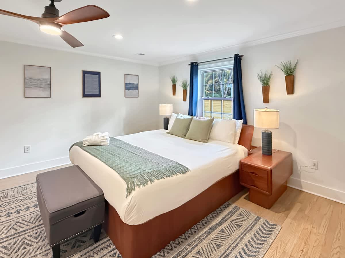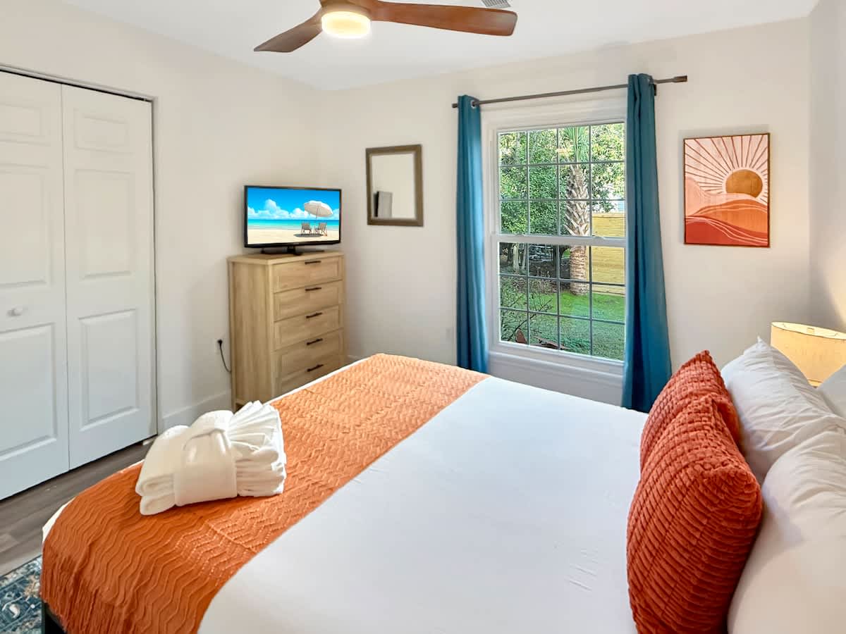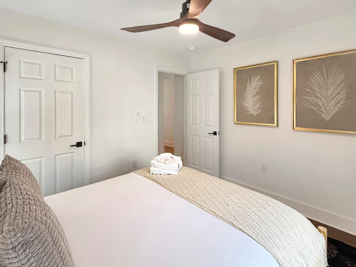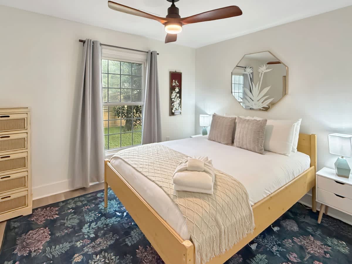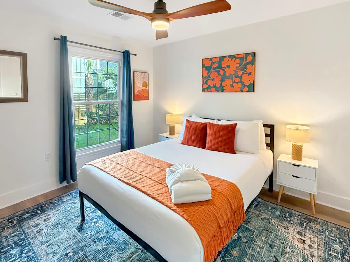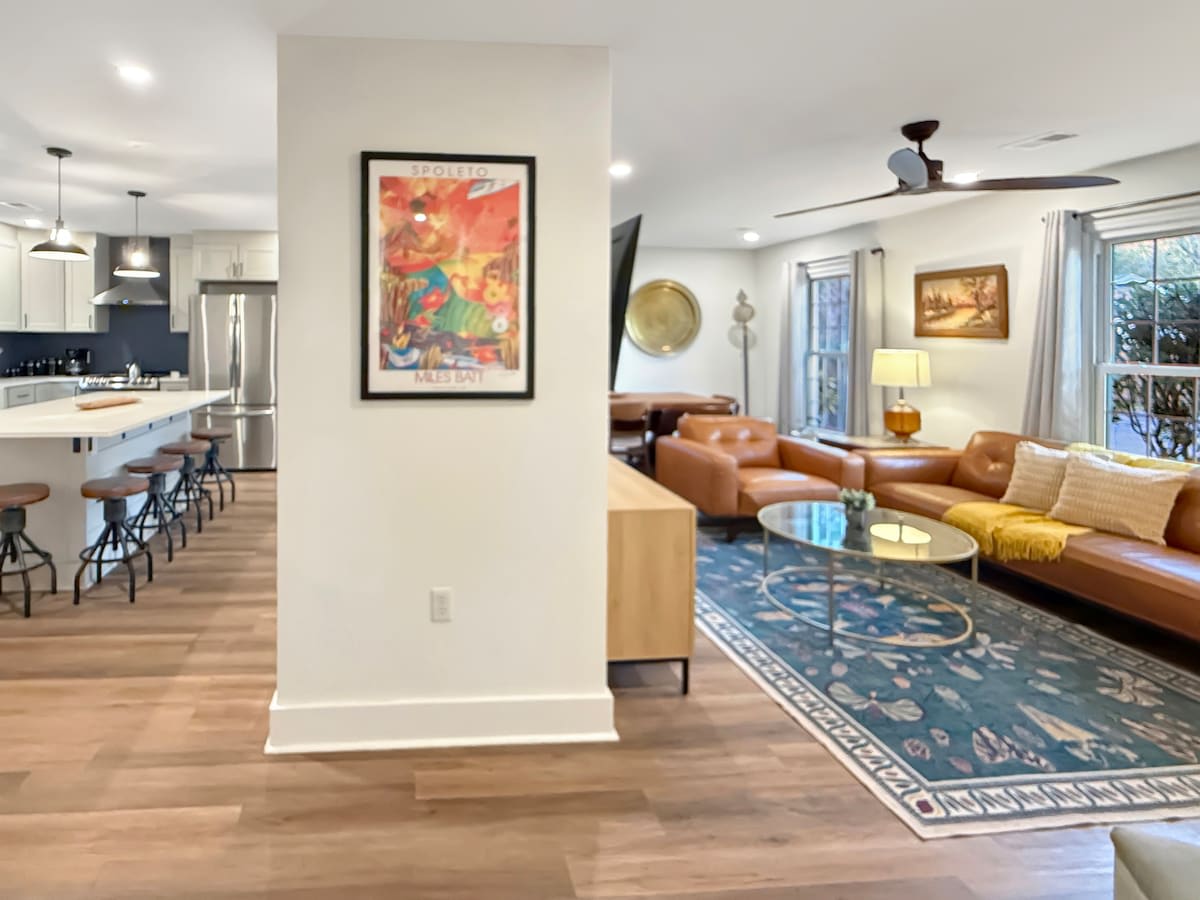 The open concept layout is designed to bring everyone together, whether you're lounging on the leather sofa or prepping dinner in the kitchen. The spacious living-dining area is anchored by a beautiful solid-wood table that seats your entire group comfortably—perfect for shared meals, game nights, or spreading out laptops for remote work. The fully remodeled kitchen features quartz countertops, stainless steel appliances, open shelving, and a generous island with seating. Whether you're preparing breakfast or hosting a group dinner, you'll find everything you need to cook and entertain with ease. The home comfortably sleeps eight guests. The primary bedroom features a king bed, an attached private bath with a large walk-in shower, and double doors that open directly onto the screened-in porch and hot tub area. Might we tempt you to end the day with a relaxing soak?!The remaining three rooms each offer comfortable queen beds, soft white linens, lots of natural light (and blackout curtains!) and plenty of closet space. All three bathrooms have been beautifully updated with clean, modern finishes and high-quality tile showers. No Charleston home is complete without a screened-in porch! With the bubbling hot tub, wall-mounted smart TV, mini-fridge, lounge seating, and overhead fan, it’s the perfect spot to unwind year-round, watch the game, and sip a cocktail out of reach from the mosquitos. The fully fenced backyard is shaded by mature oaks and makes for a peaceful, private outdoor space ideal for kids and pets (with approval) We expect guests to treat our home and neighbors as if they were your own. If you’ve ever wondered what it would be like to live in the Lowcountry, this is your chance to experience it! Please help us keep this place special.